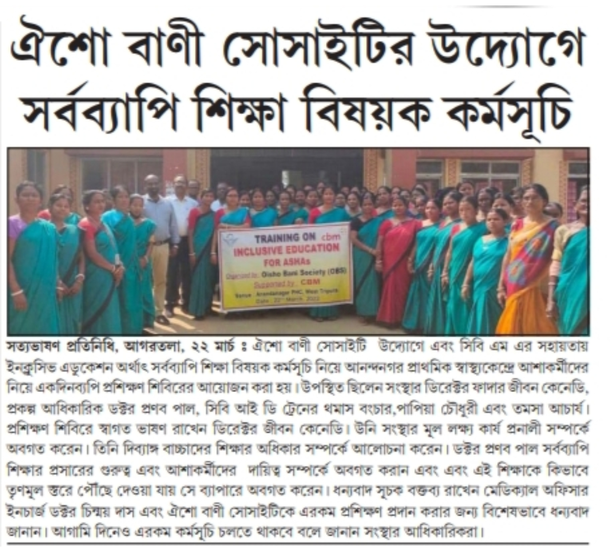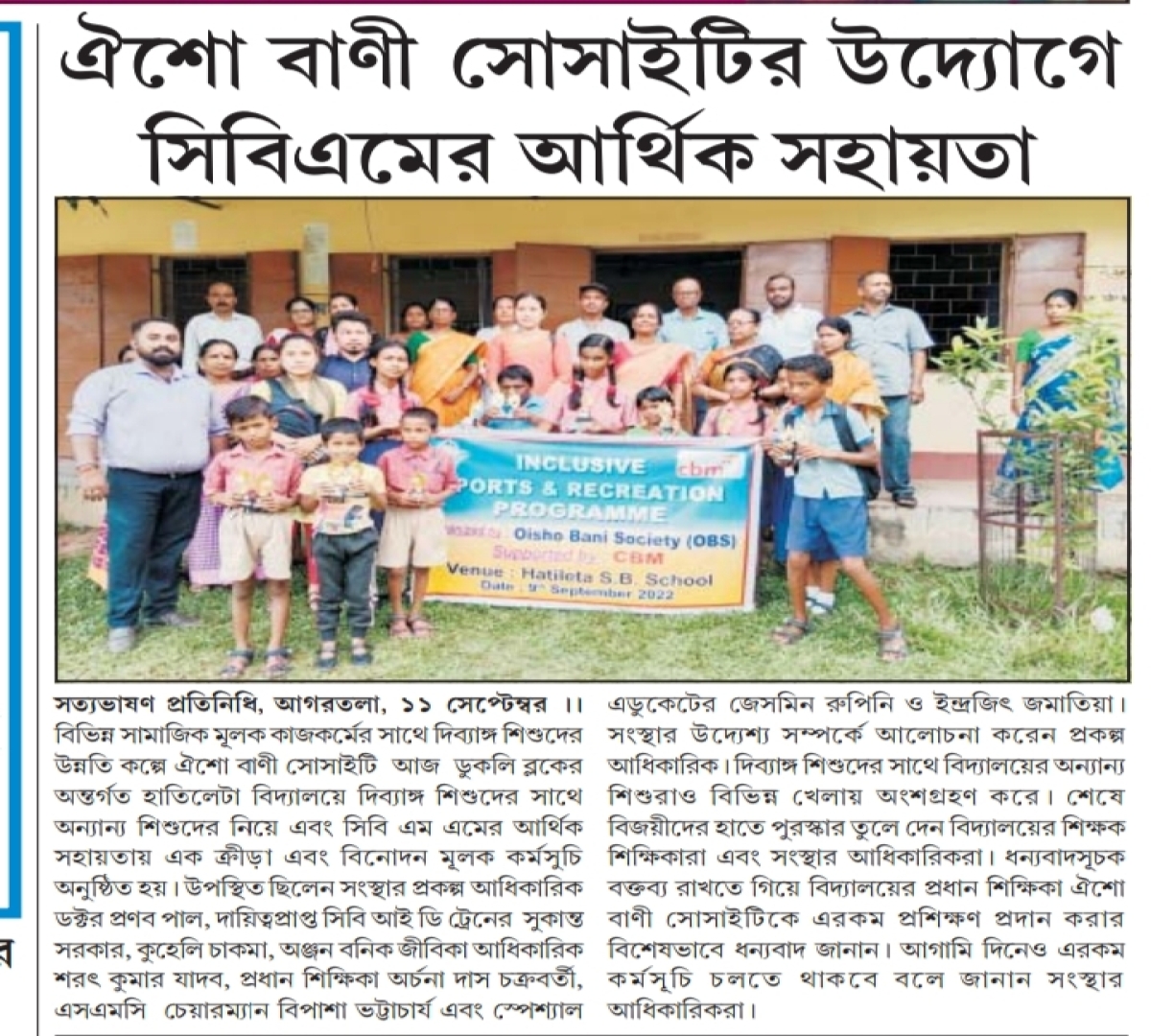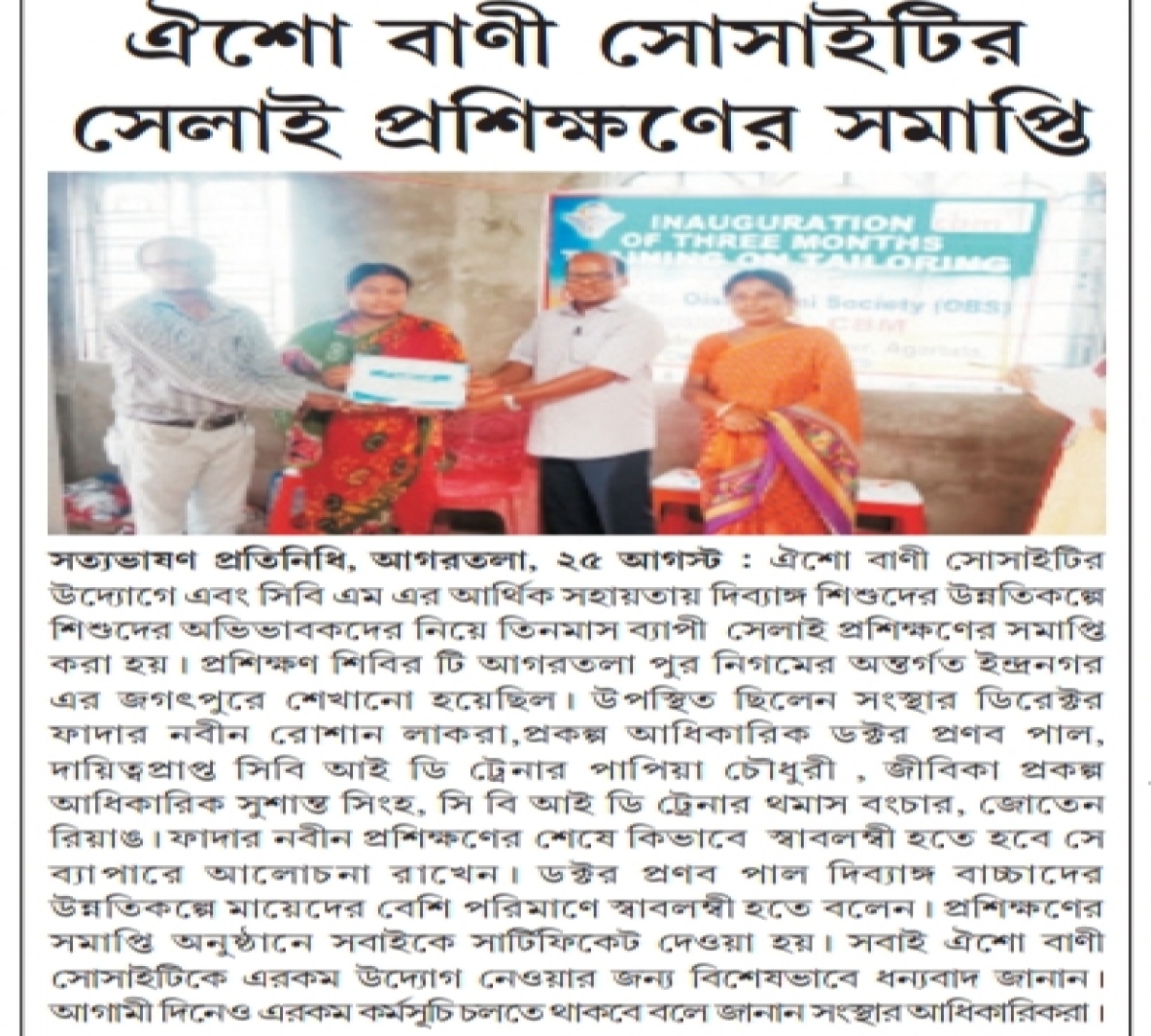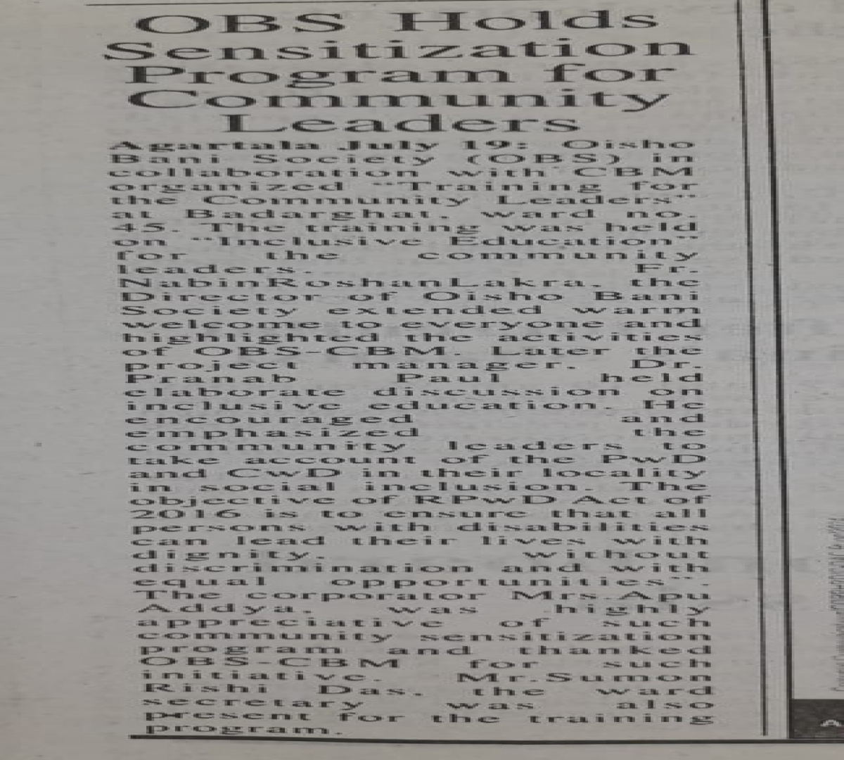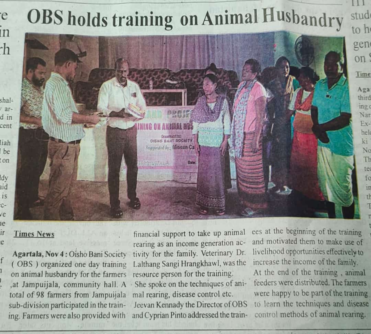 Oisho Bani Society (OBS) is a charitable organization registered under the Societies Registration Act 1860, in the year 2000 with registration number 3613 at Ambassa, Dhalai, Tripura.