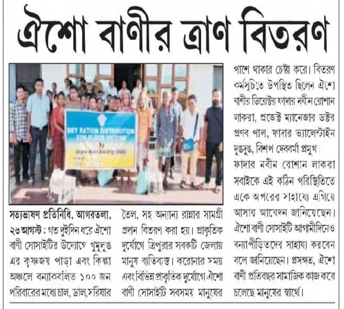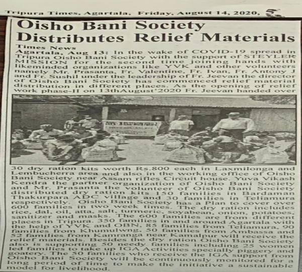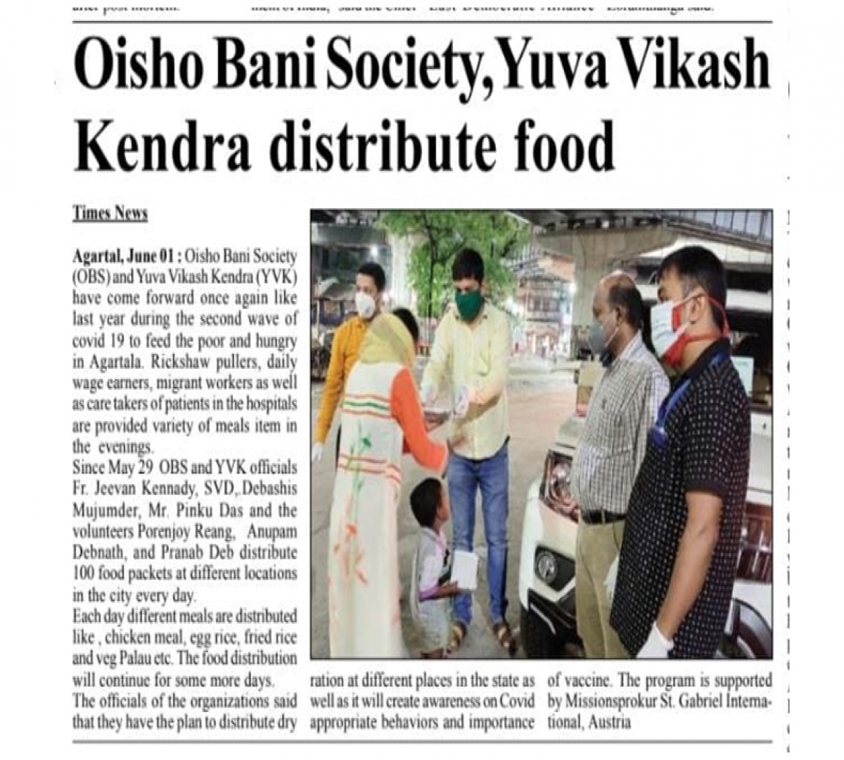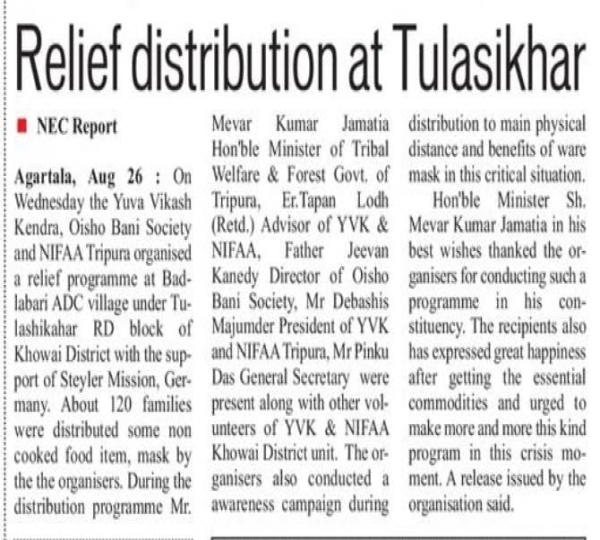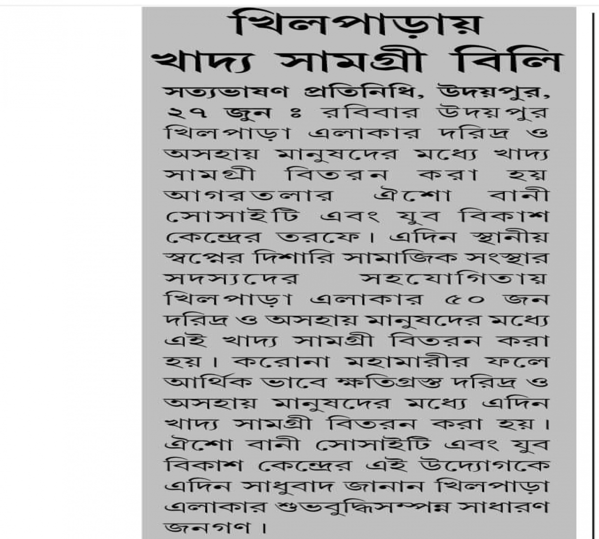Oisho Bani Society, Yuva Vikash Kendra distribute food - Tripura Times (01.06.2021)