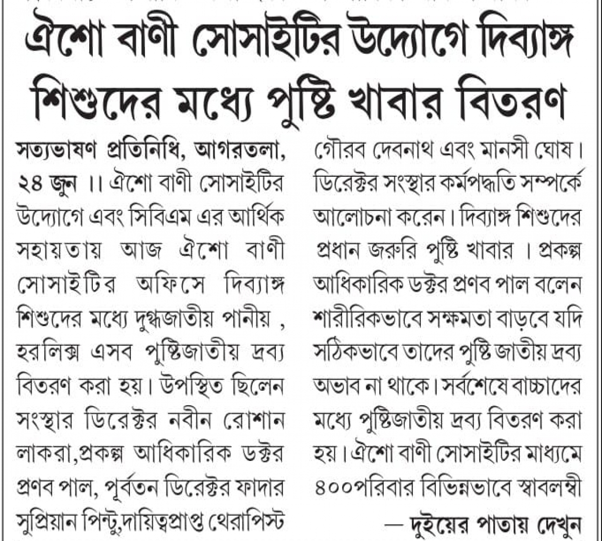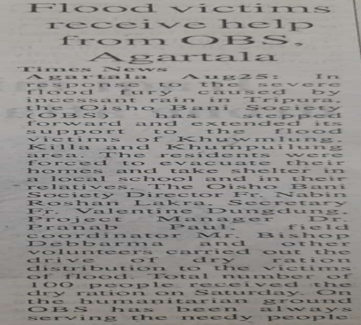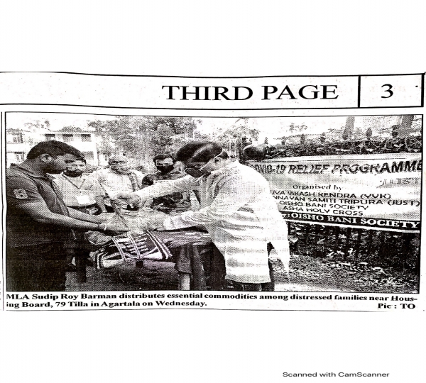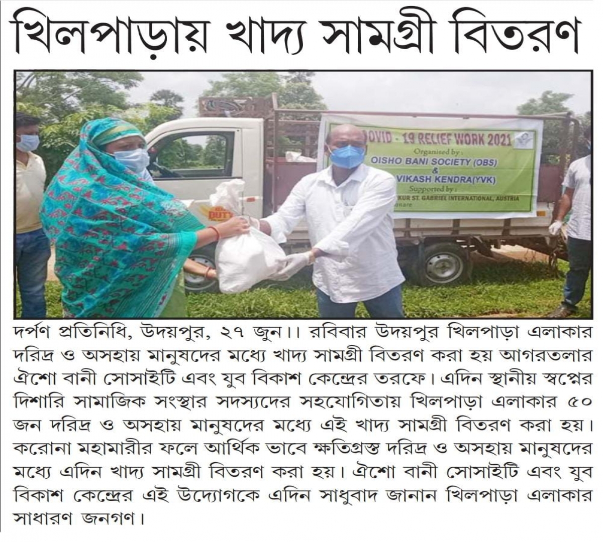 Oisho Bani Society (OBS) and Yuva Vikas Kendra (YVK) distribute Dry Ration (Tripura Times - 27.06.2021)