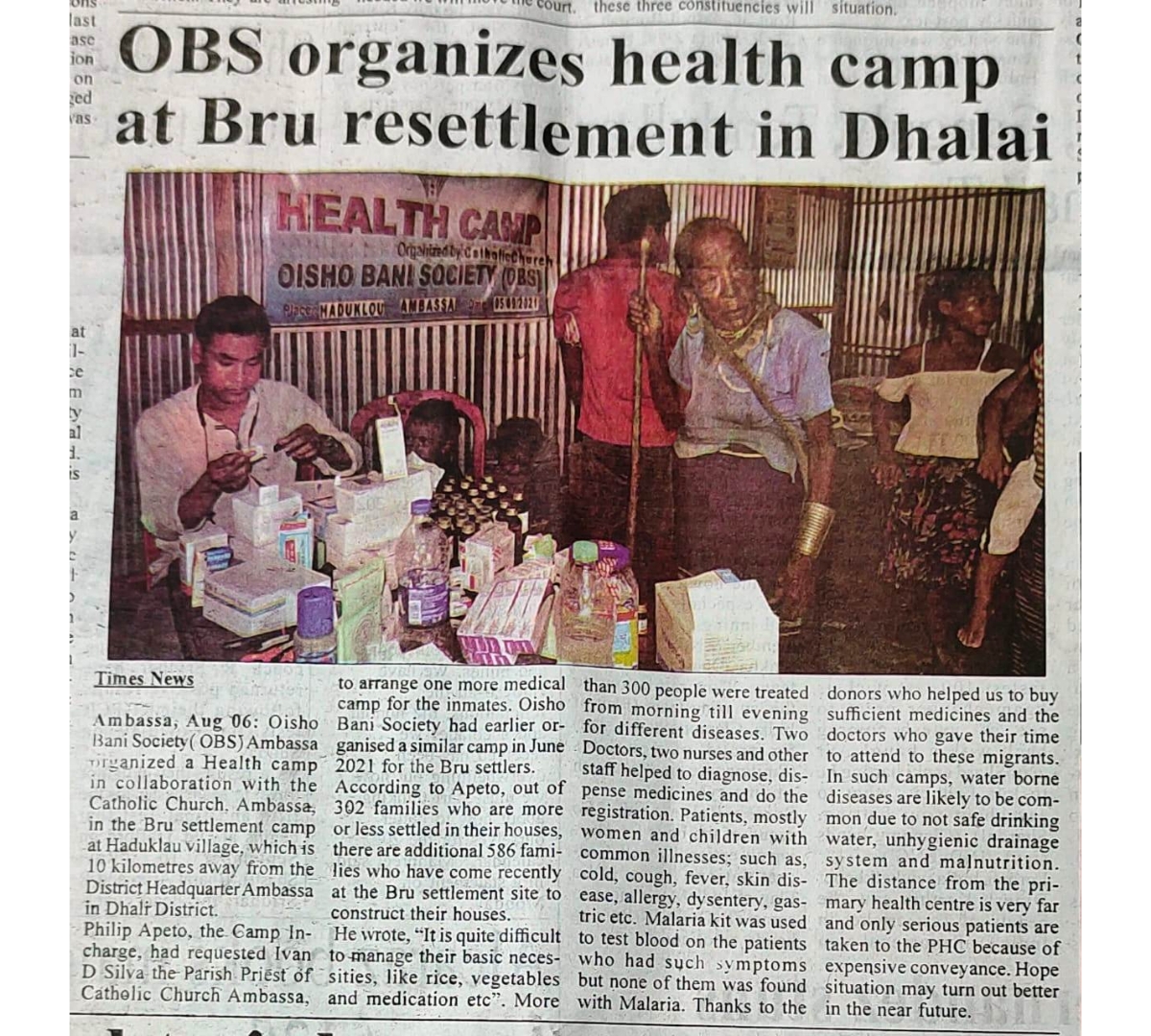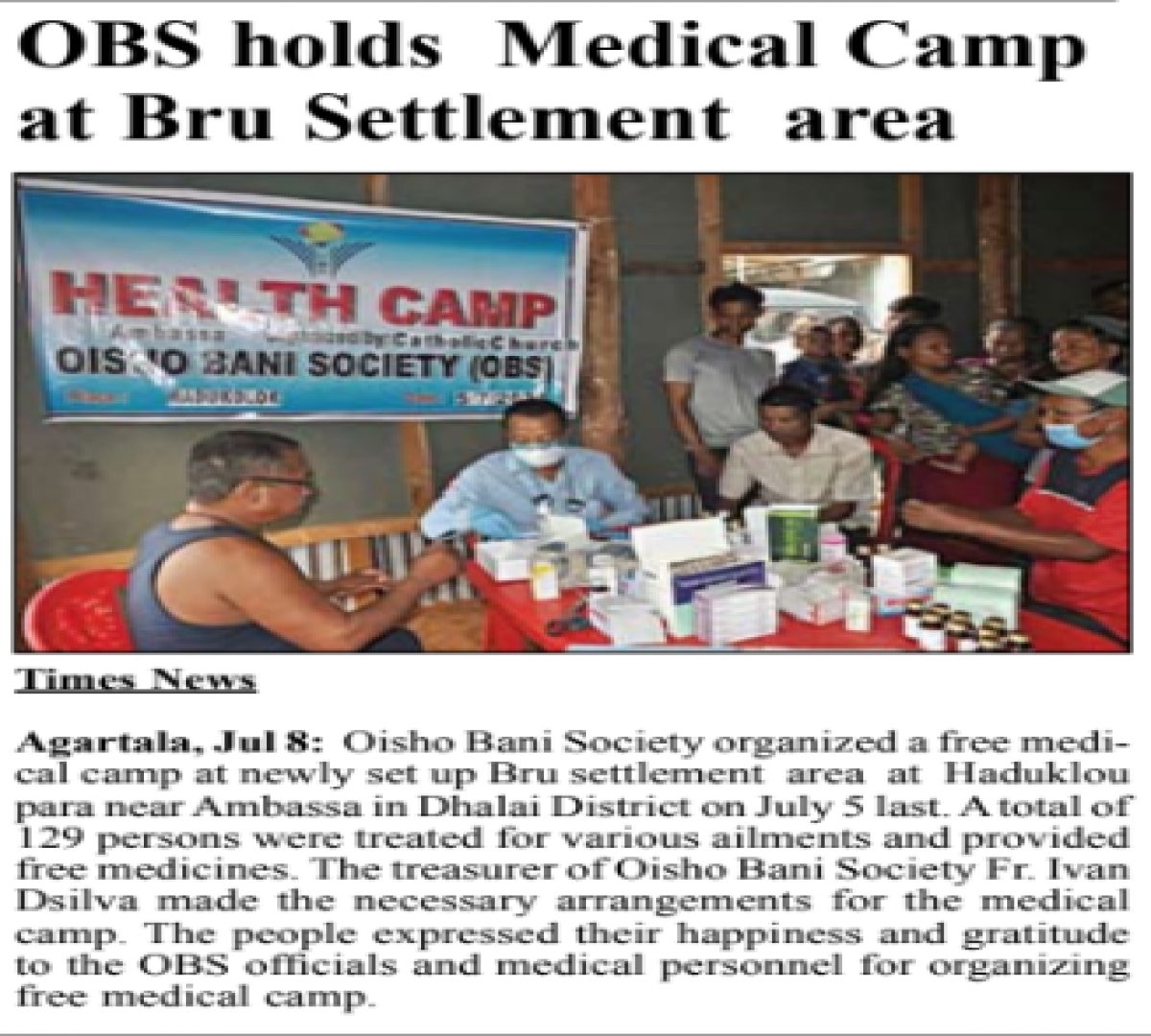 OBS organizes health camp at Bru resettlement in Dhalai (Tripura Times - 06.08.2021)