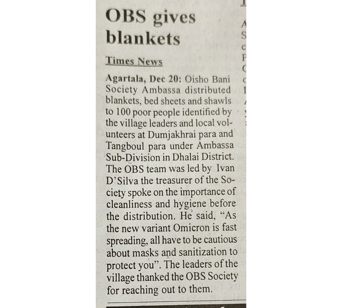OBS gives blankets (Tripura Times 20-12-2021)