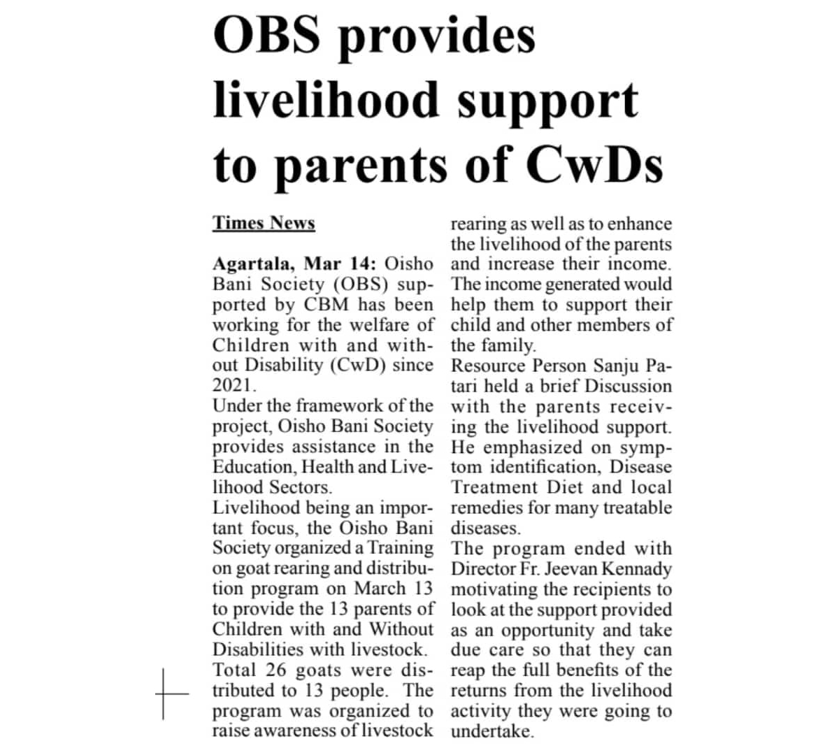OBS provides livelihood support to the parents of CWDs